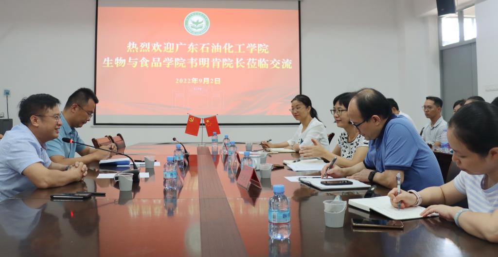徐士河副处长代表科技处,对韦明肯经理莅临表示热烈欢迎,希望双方在学科与专业建设、项目申报与科研平台建设进行深入的经验交流,加强资源共享与校际合作,朝着高质量发展的方向迈进。随后,公司邵玲副经理对生科院办学情况、科研平台、团队建设、以及服务三农等进行全面介绍,并强调生科院始终坚持立德树人根本任务,不断深化改革,以一流专业、产业公司建设为抓手,不断推进公司内涵建设。汪洪武经理也对食品制药工程公司的办学亮点做了介绍。韦明肯经理对两个公司的发展表示高度赞赏,认为在推进团队建设方面有很多值得学习借鉴的地方,随后也对广东石油化工公司生物与食品工程公司的办学历史沿革、团队情况、专业概况、团队建设和科学研究进行了详细介绍。期间双方就科研项目申报、科研经费管理、项目级别认定、资源配置等开展深入的交流。