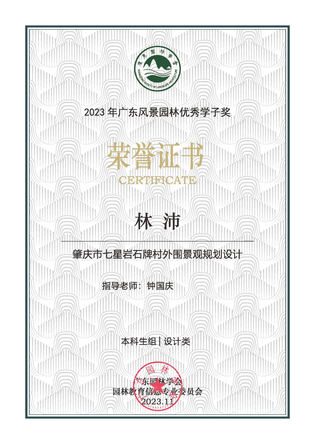 (钟国庆指导林沛同学获得广东风景园林优秀学子奖证书)