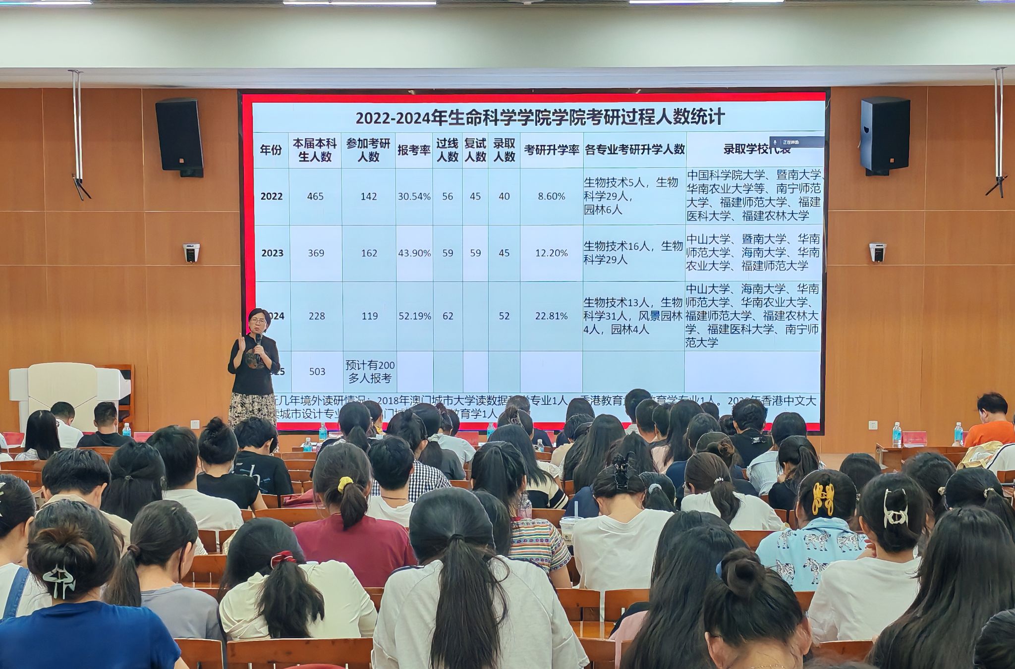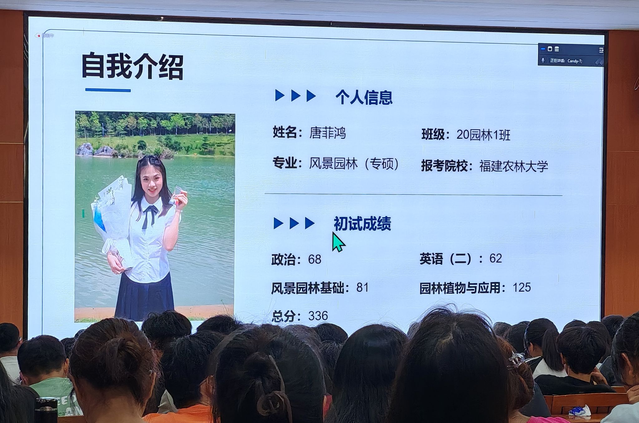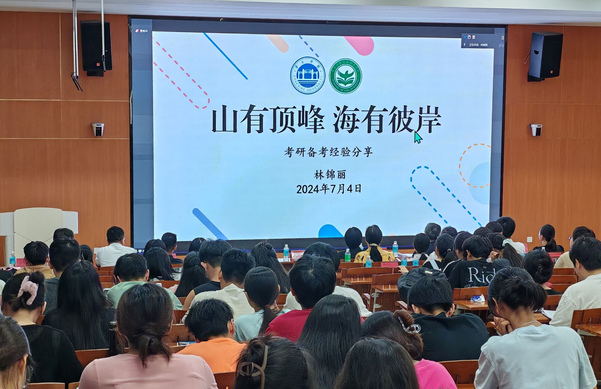 大会的高潮部分是由2020级成功上岸的林锦丽和唐菲鸿两位师姐通过线上分享她们的考研经验。她们以自己的亲身经历为例,毫无保留地分享备考过程中的心得体会和策略技巧,为即将踏上考研之路的学弟学妹们提供了实用的建议,让在座的同学们受益匪浅。