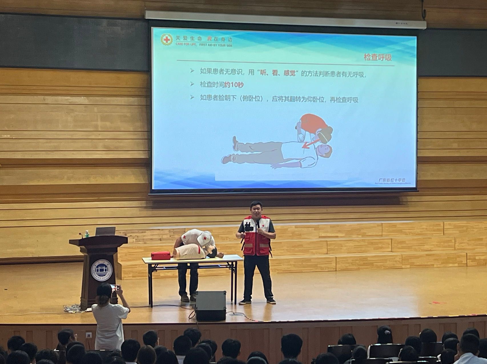在实操环节,同学们积极上台体验徒手心肺复苏实操等急救操作流程,肇庆市红十字会培训老师耐心地指导同学们正确进行徒手心肺复苏和AED的使用,让同学们在实践中掌握应急救护技能。