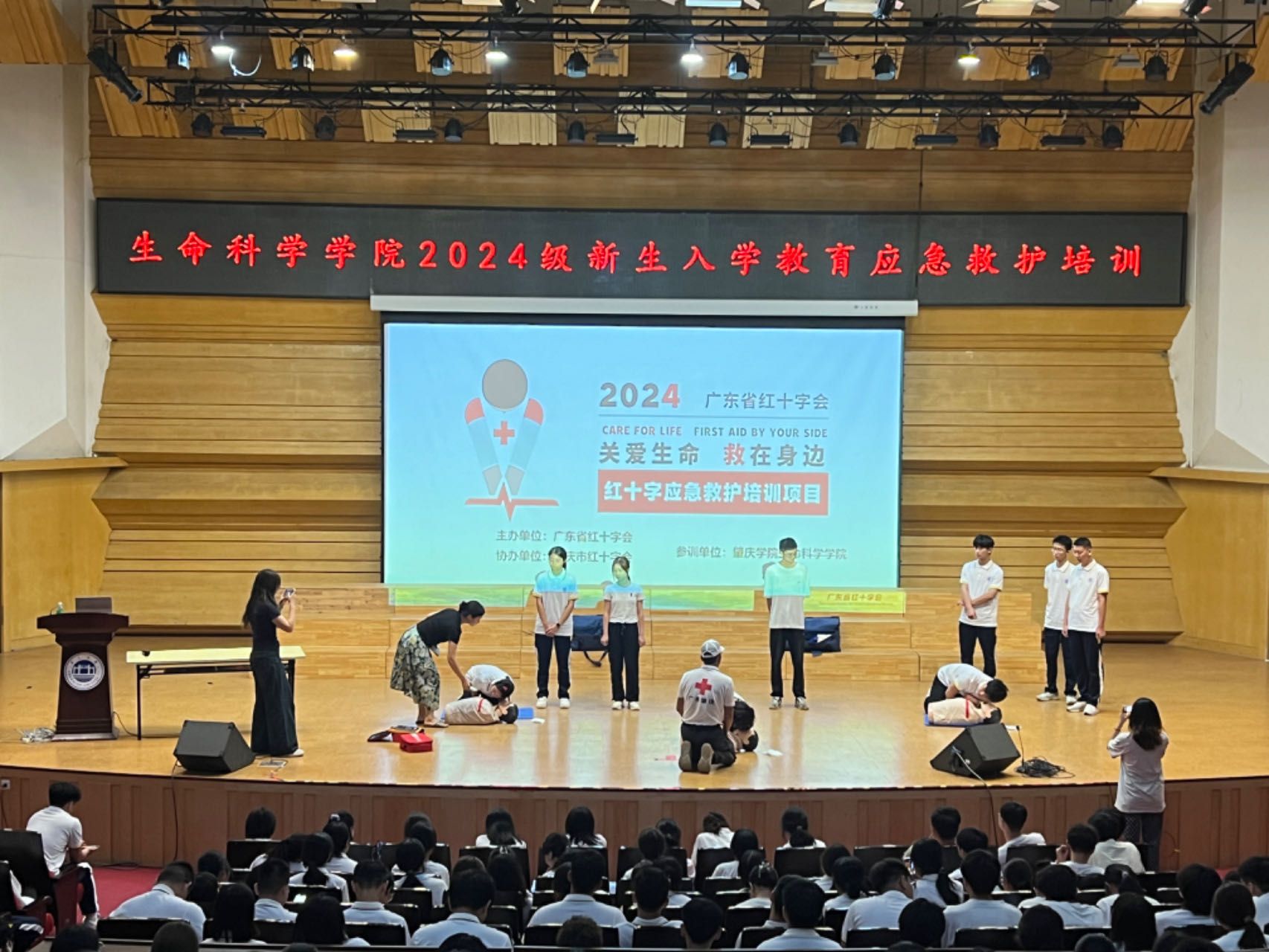 此次培训内容丰富,涵盖常见意外伤害应急救护常识以及徒手心肺复苏、AED使用方面的实操。肇庆市红十字会的培训团队讲解专业清晰,语言幽默风趣,极大地调动了同学们的学习热情。他们用生动的案例和形象的示范,将专业的应急救护知识深入浅出地传授给新生们。