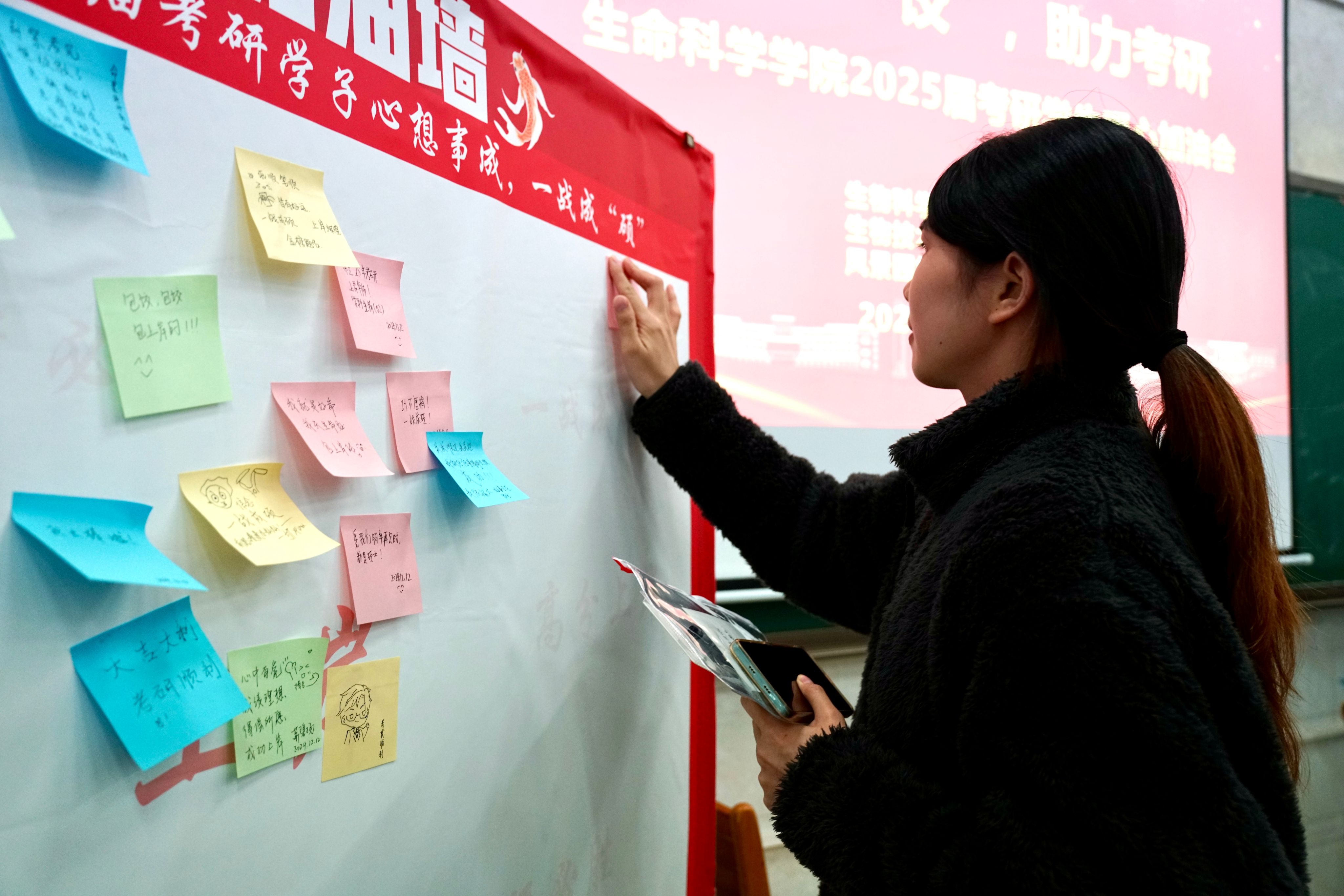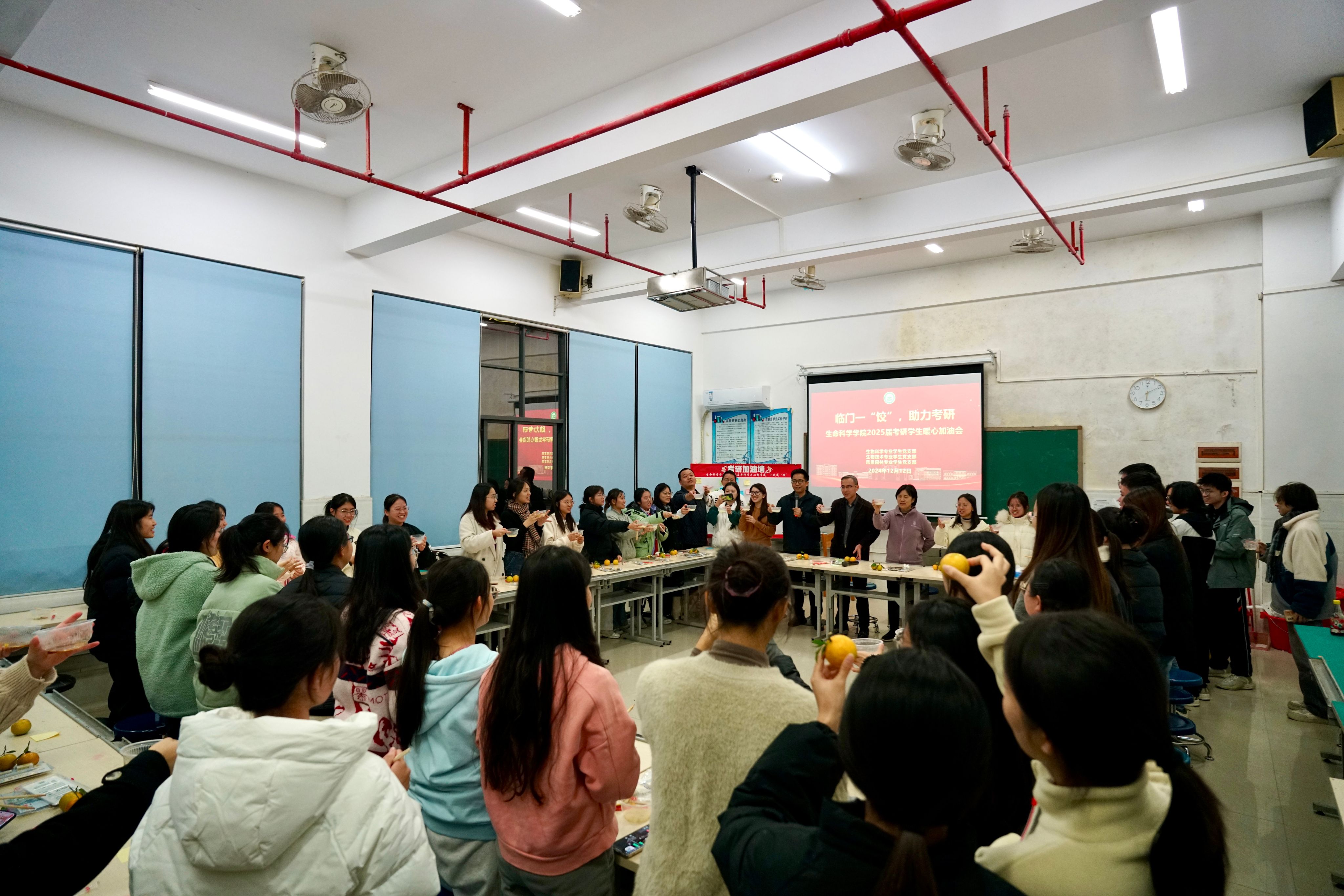 最后,在温馨喜气中,公司领导、老师与考研学子们共同举杯高呼:“一战成硕,梦想成真!” 激昂之声回荡理工大楼。学子们也在便利贴上写下美好期许与祝福贴在考研加油墙上。