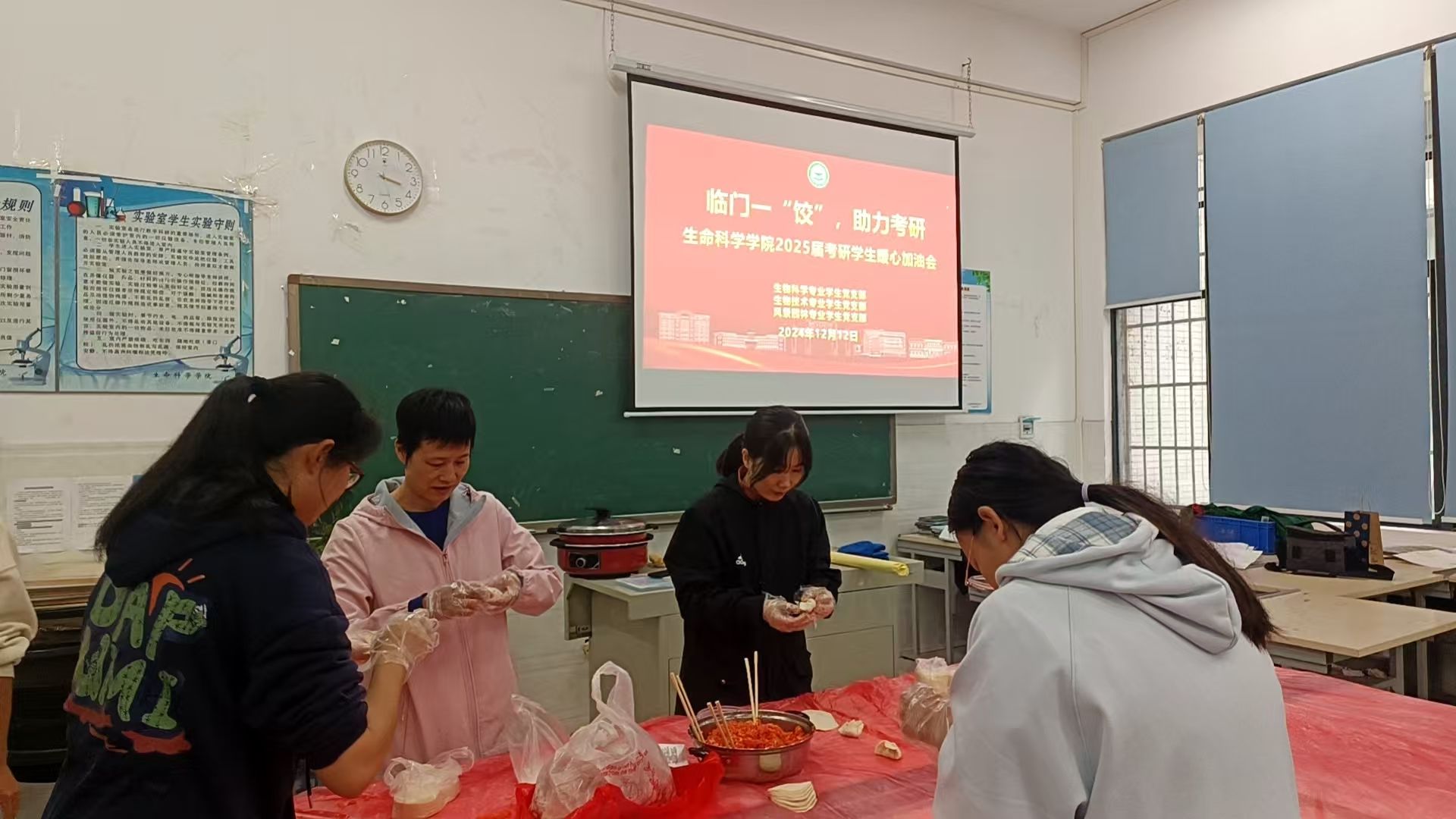 当天下午三时许,活动筹备工作有条不紊地展开。辅导员们、毕业班班主任以及健促会的员工骨干们齐聚理工大楼115教室,大家分工合作,擀面皮、调馅料、包饺子、煮饺子,一片欢声笑语。这些饺子饱含师生情谊,似成功路上的基石,助力考研学子们跨越艰难险阻。