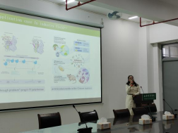 活动伊始,陈华讲述了“青年博士学术沙龙”的目的和意义,强调了学术交流的重要性,并鼓励年轻学者积极分享自己的研究成果。本期由谢京合博士和潘莹博士作为主讲人,分别以“脂肪酸合成酶FASN通过调控MAPK-ICAM1信号轴促进肝癌干细胞转移能力的机制研究”和“A genetic algorithm scheme in directed proteindesign using co-evolution landscape and its application”为主题展开汇报。