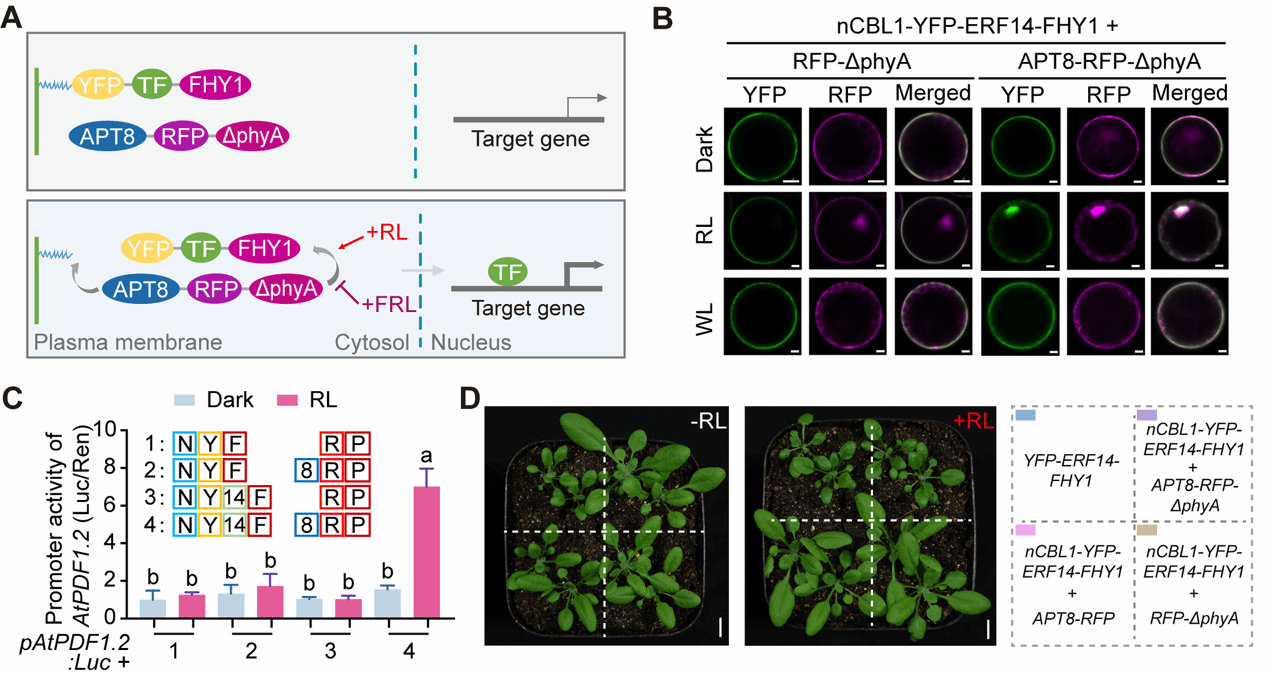 近日,Cell Press旗下植物科学著名学术期刊Plant Communications发表了公司青年教师黄俊文博士与华南师范大学蛋白质修饰与逆境生物学团队合作完成的研究论文“An optogenetic transcription regulator controlled by reversible S-acylation in plants”。该研究将光遗传学工具与可逆蛋白质棕榈酰化修饰相结合,构建了一套可通过红光/远红光可逆调控的转录系统。该系统可精准控制转录相关因子在细胞膜与细胞核之间的移动,实现对目标基因表达的快速诱导与适时关闭,有效规避了持续激活导致的生长抑制。