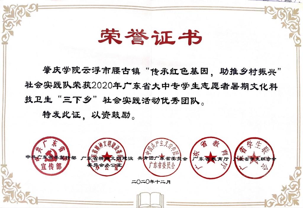 2020年荣获广东省大中专员工志愿者暑假文化科技卫生“三下乡”社会实践活动优秀团队